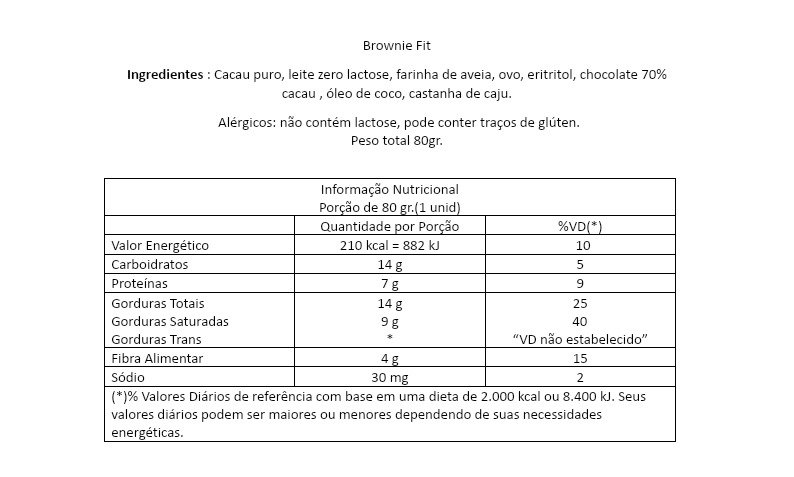 Cacau puro, leite zero lactose, farinha de aveia, ovos, eritriol, chocolate 70% cacau, óleo de coco, castanha de caju