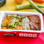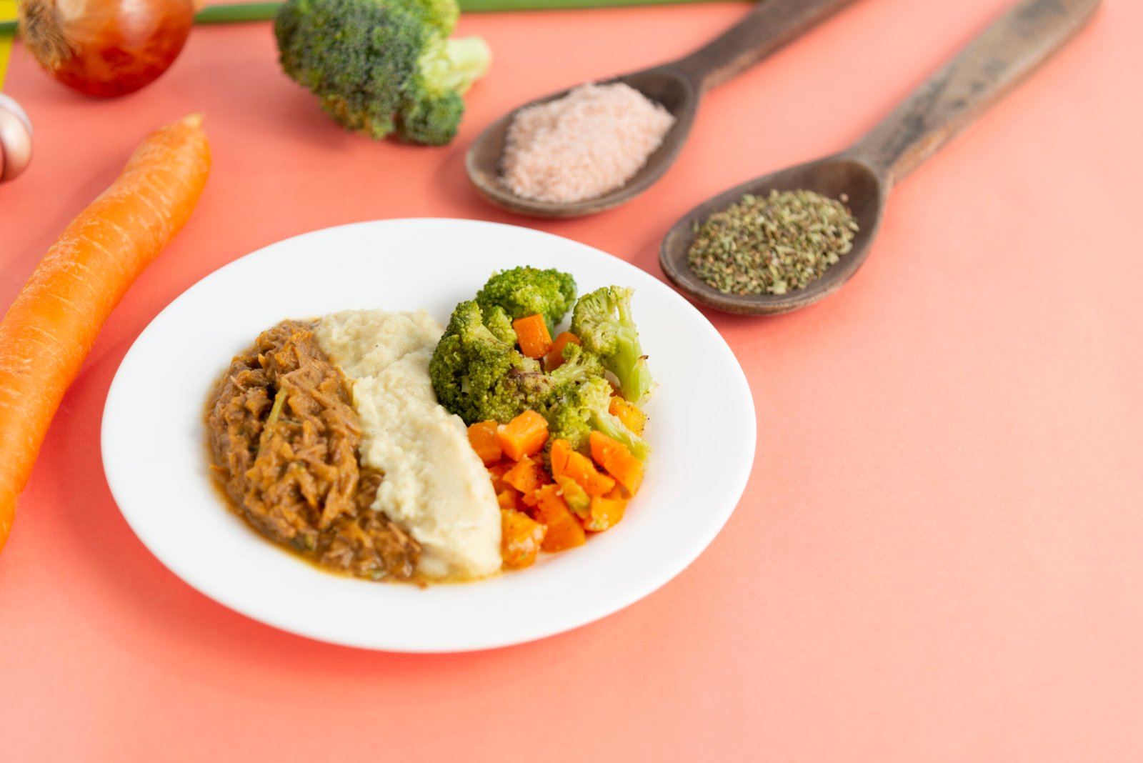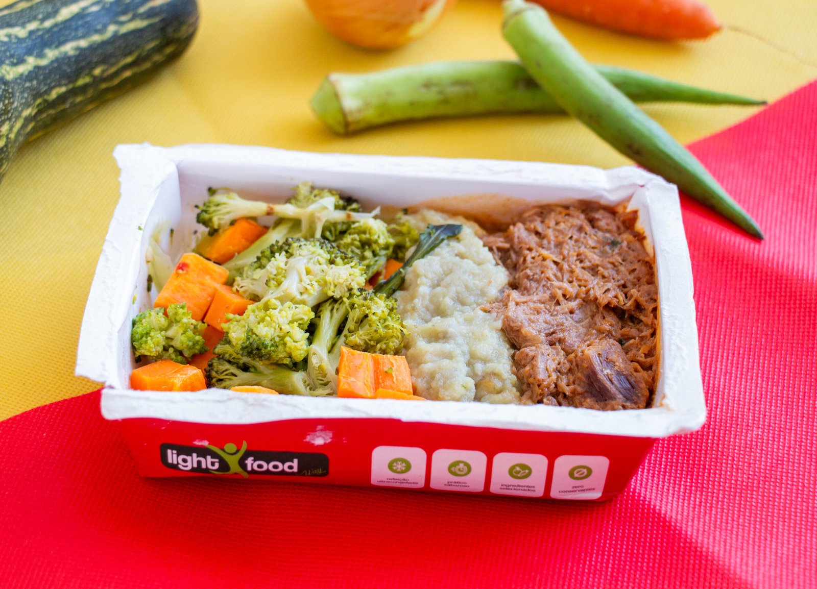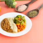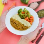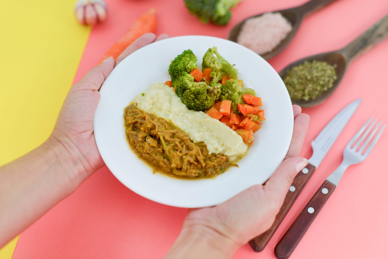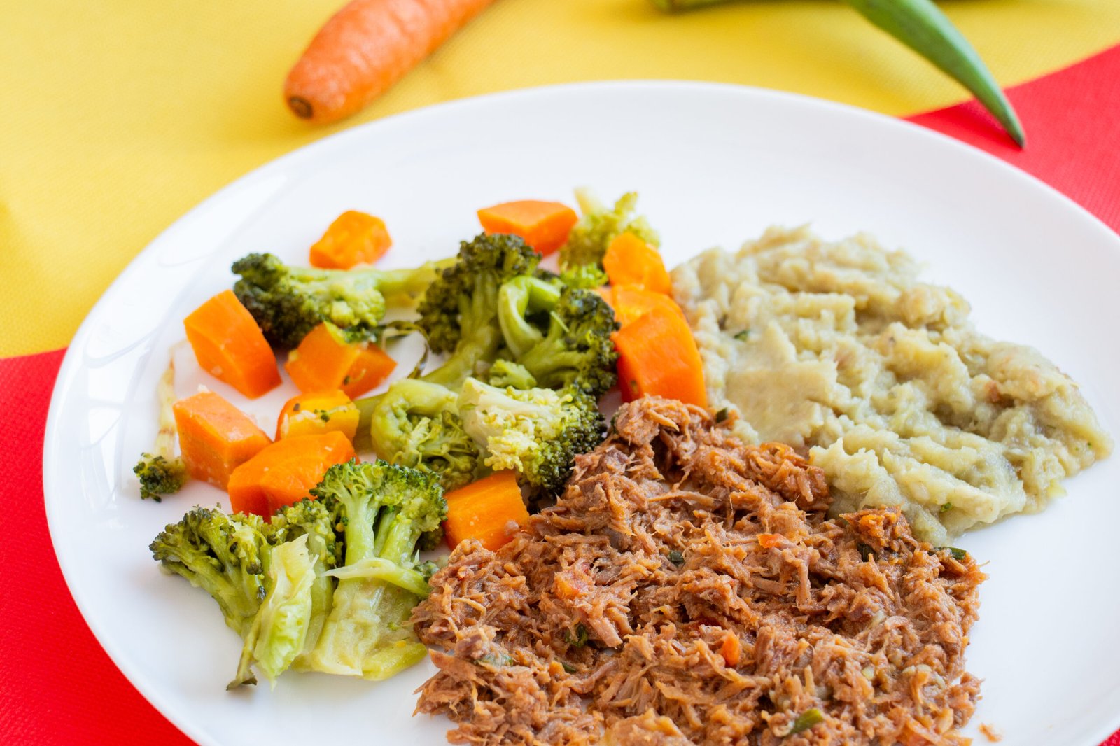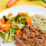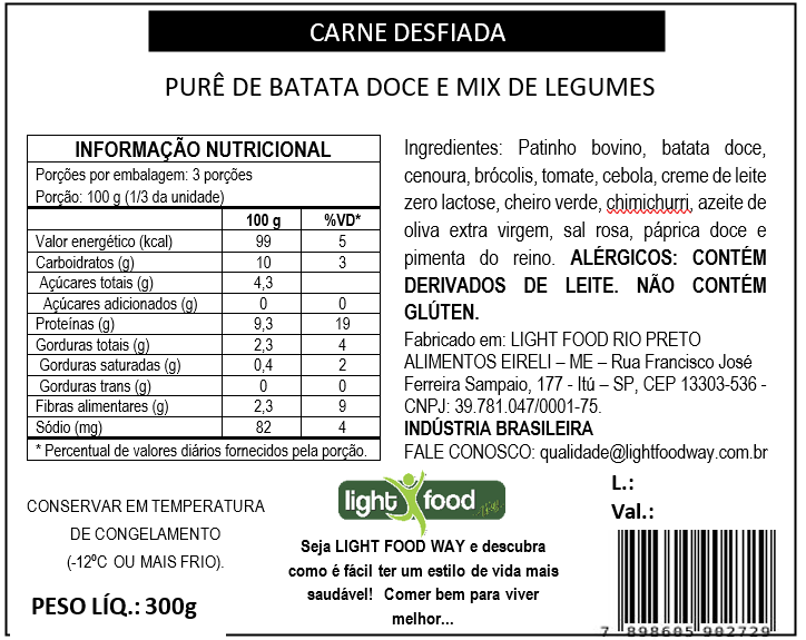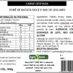 Carne desfiada, purê de batatas cremoso, legumes.