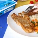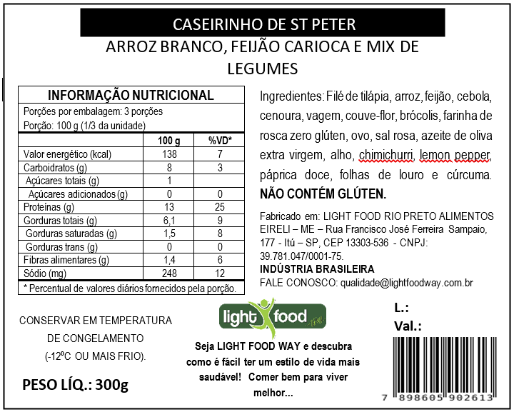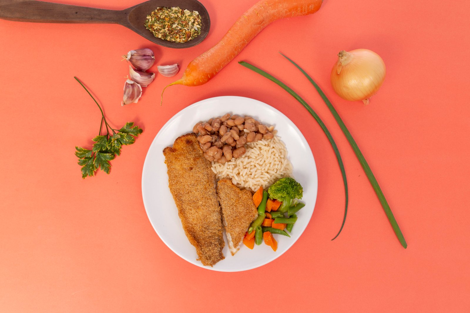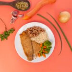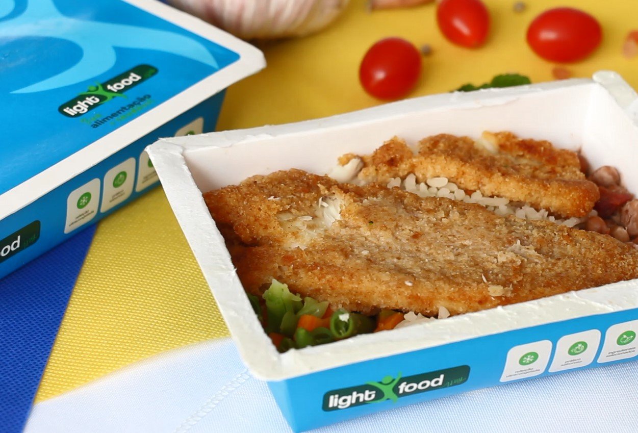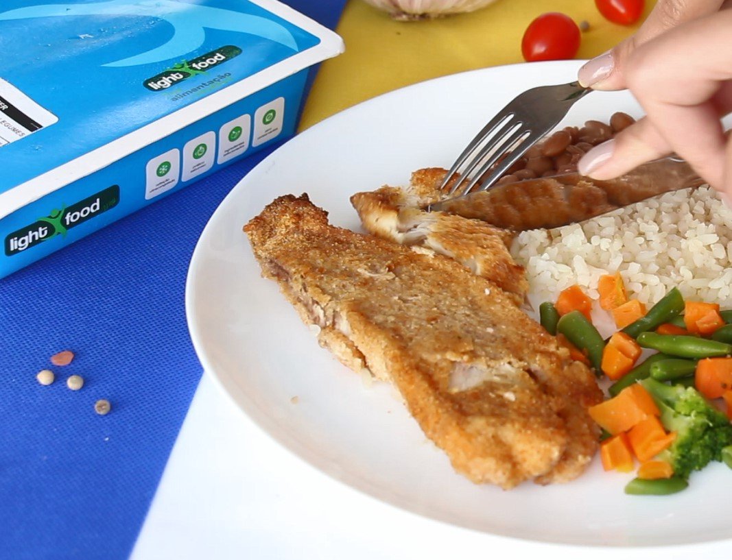 Filé de peixe empanado, arroz branco, feijão carioca, mix de legumes