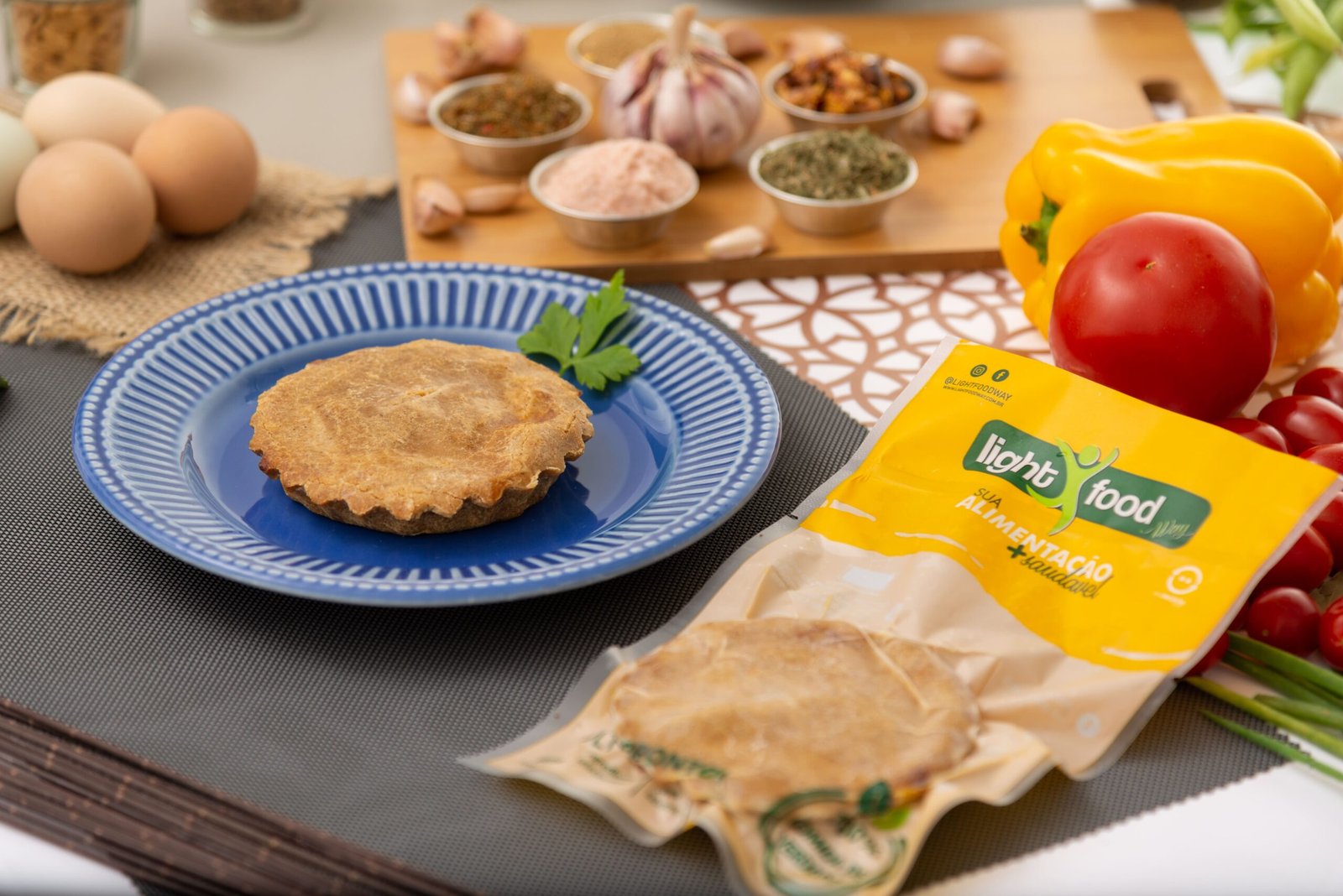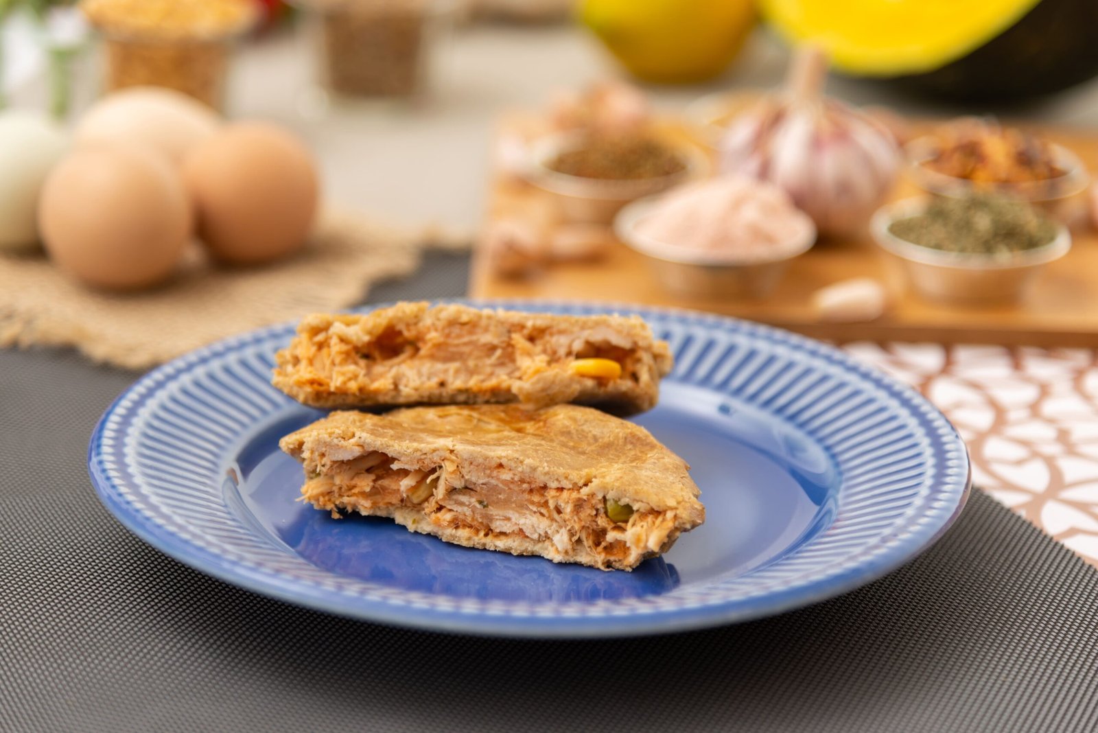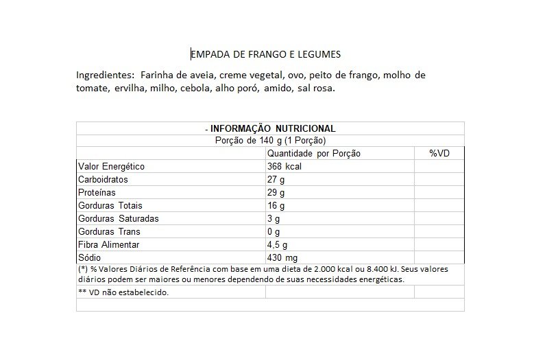 Farinha de aveia, creme vegetal, ovos, peito de frango, molho de tomate, ervilha, milho, cebola, alho poró, amido, sal rosa.