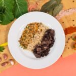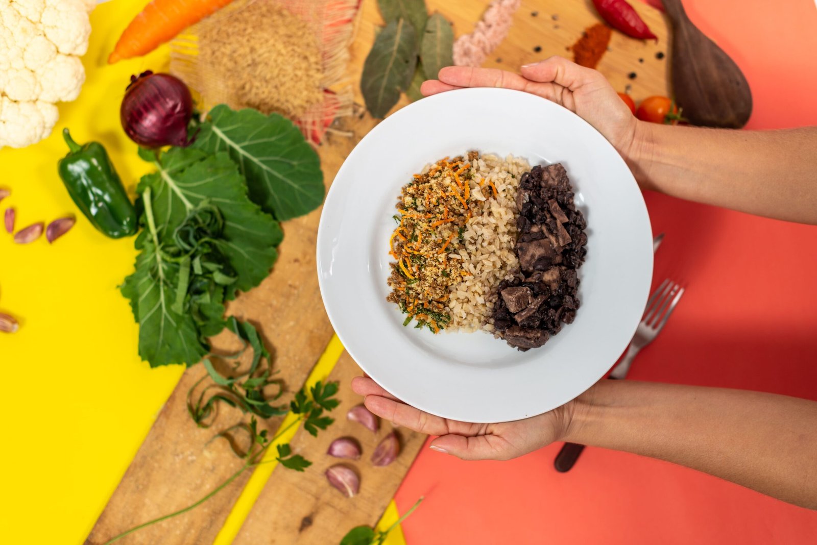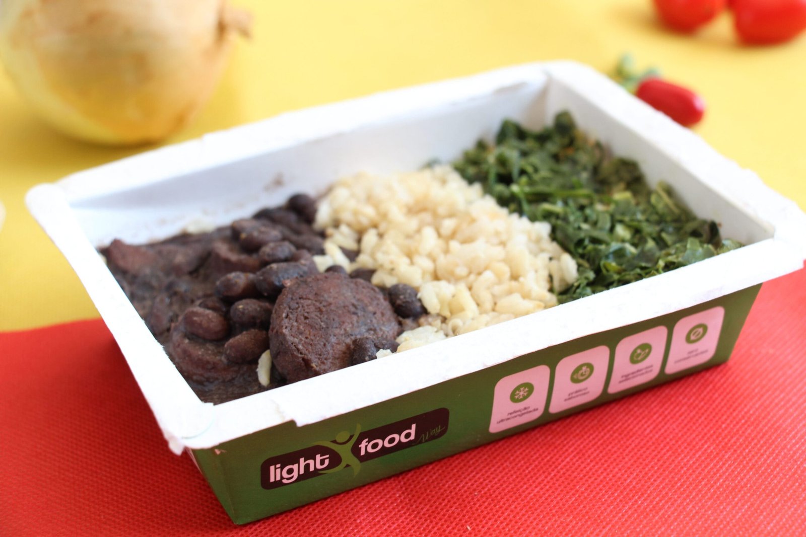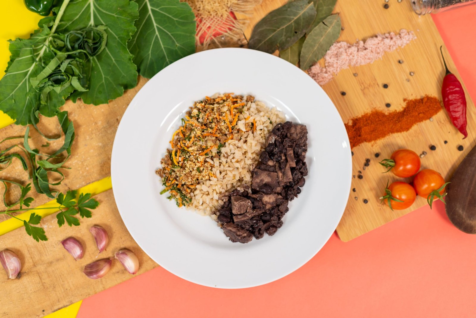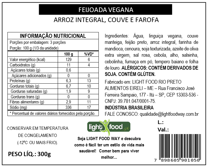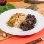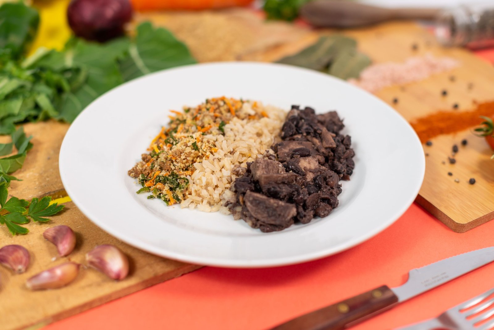 Feijoada vegana ,arroz integral, couve, farofa de soja.