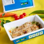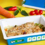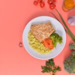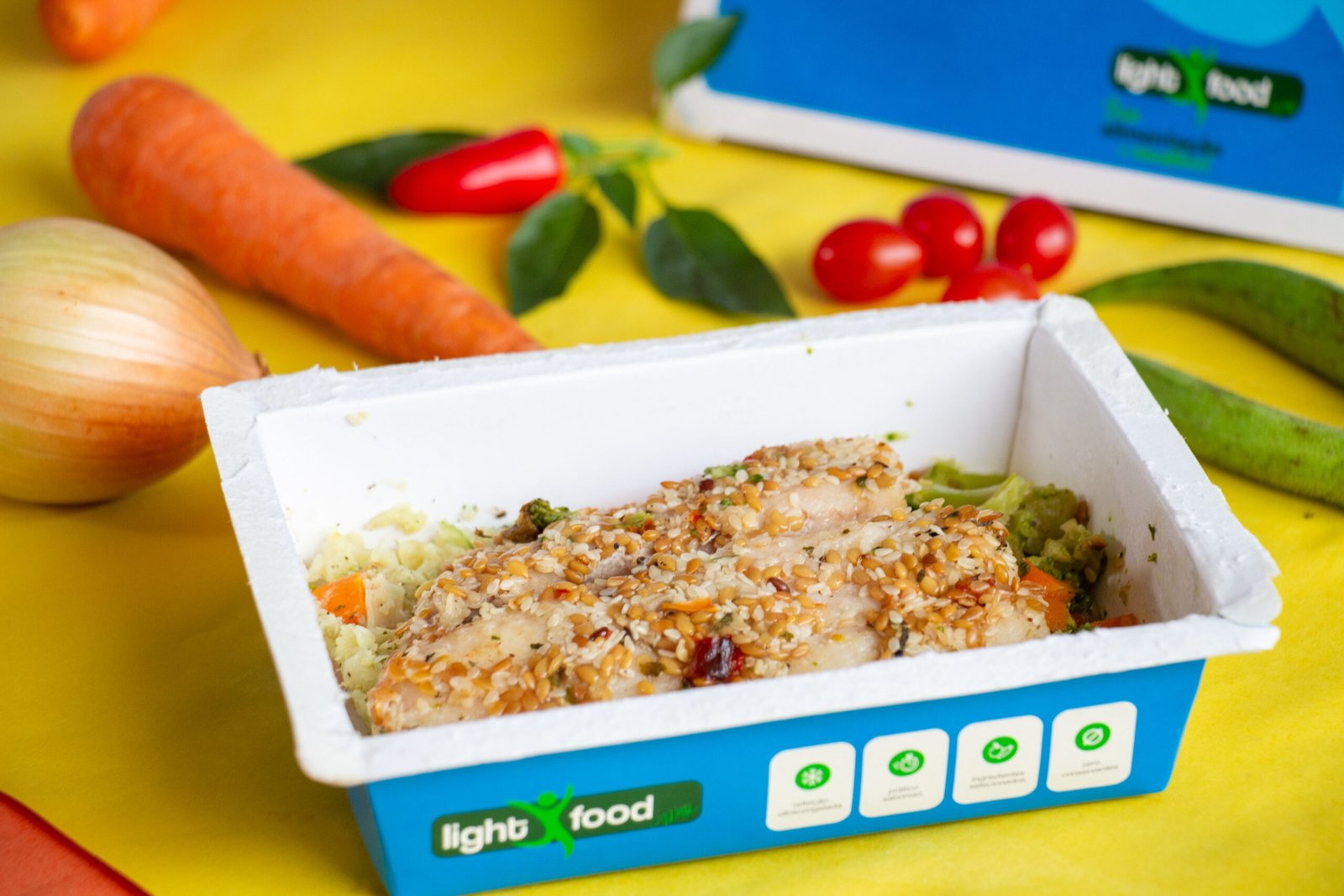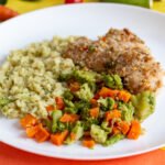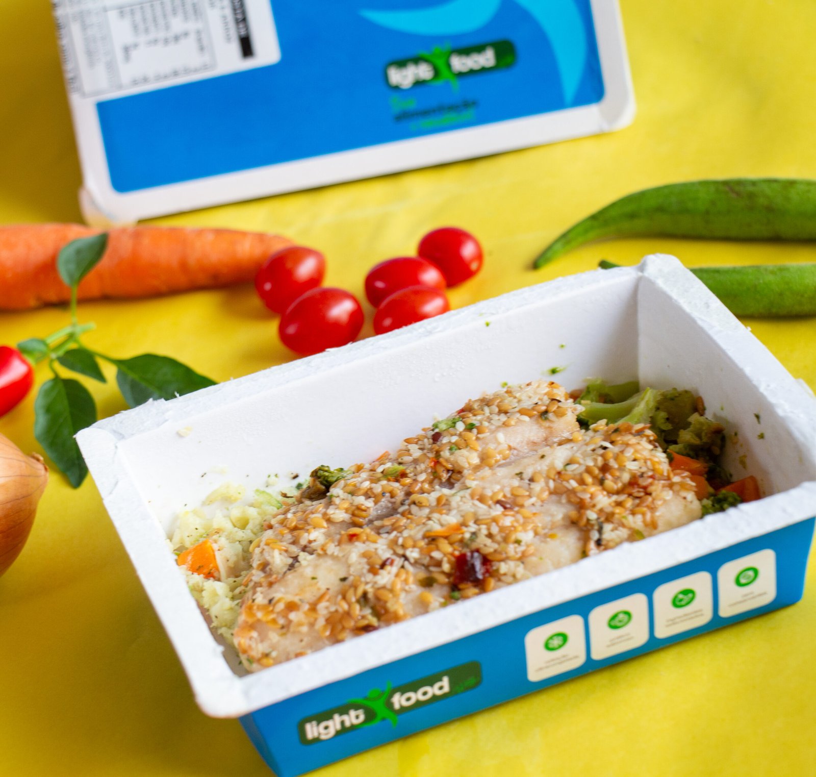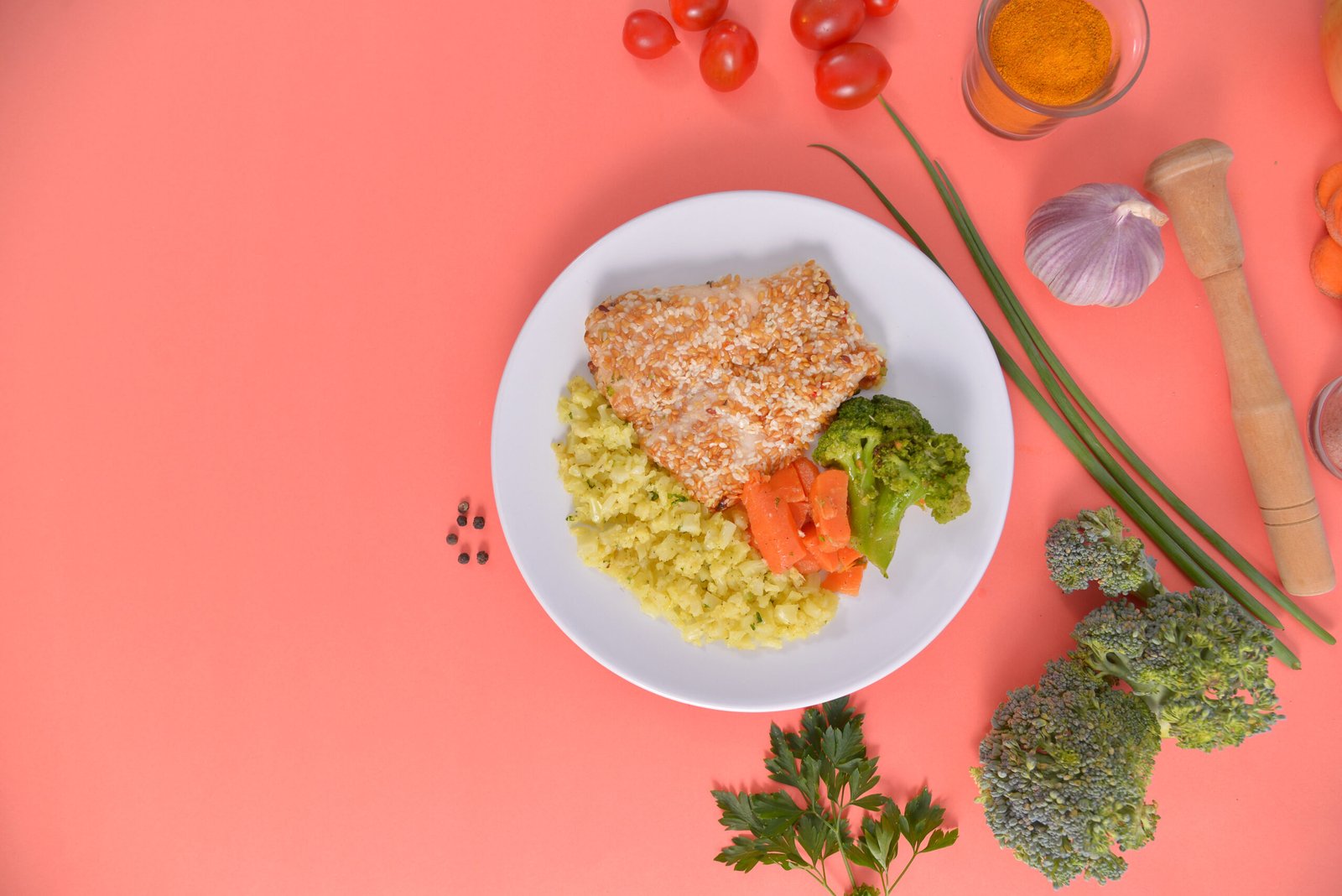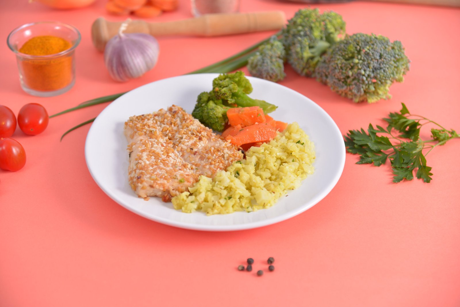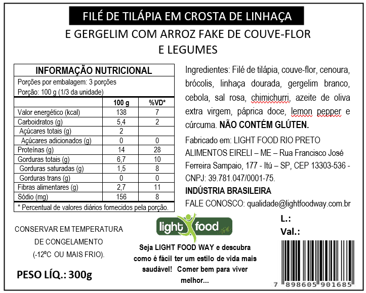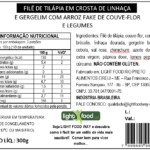 Filé de tilápia com crosta de gergilim e linhaça dourada, arroz fake de couve flor, legumes cozidos.