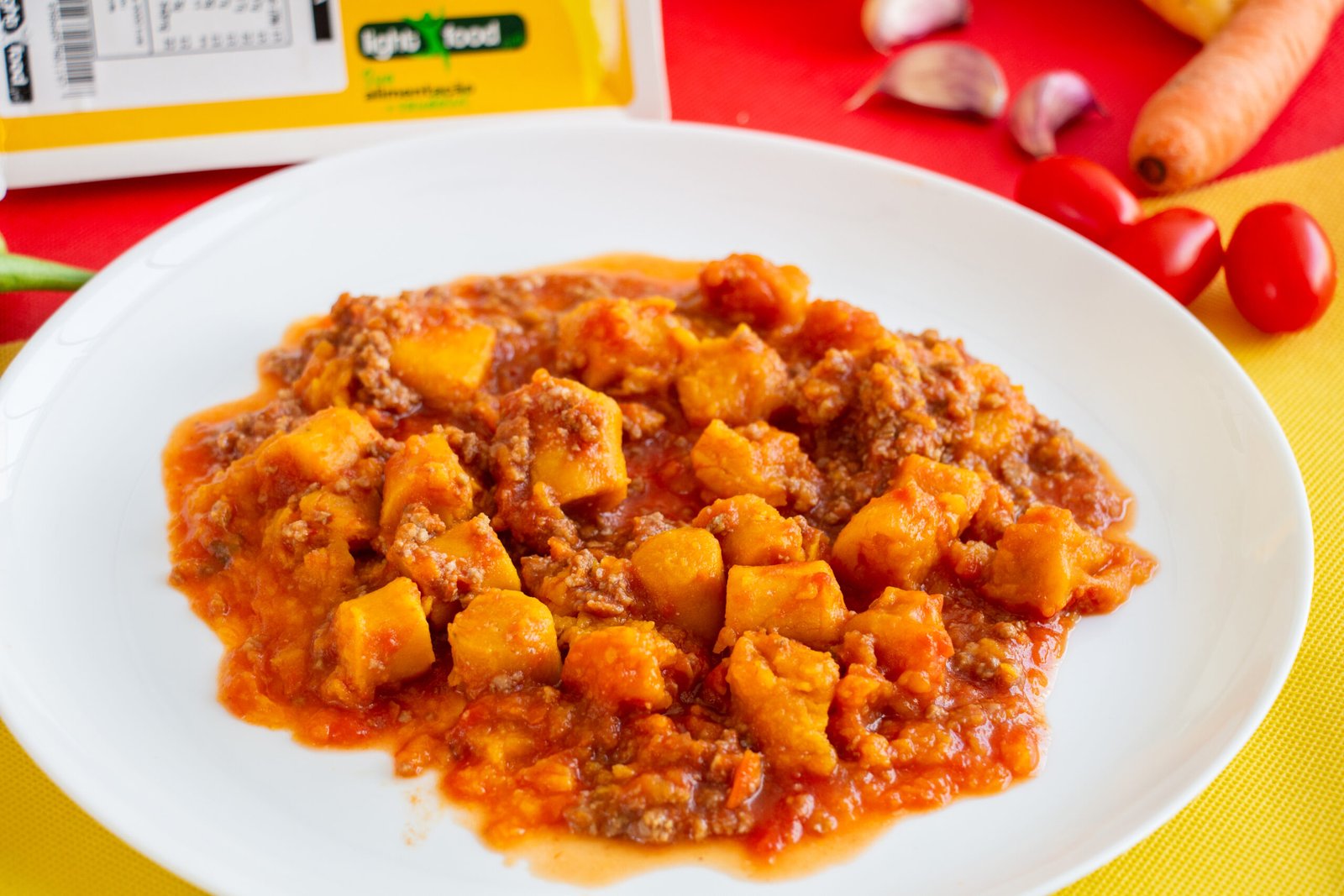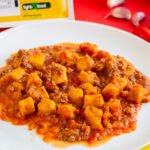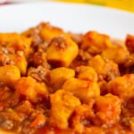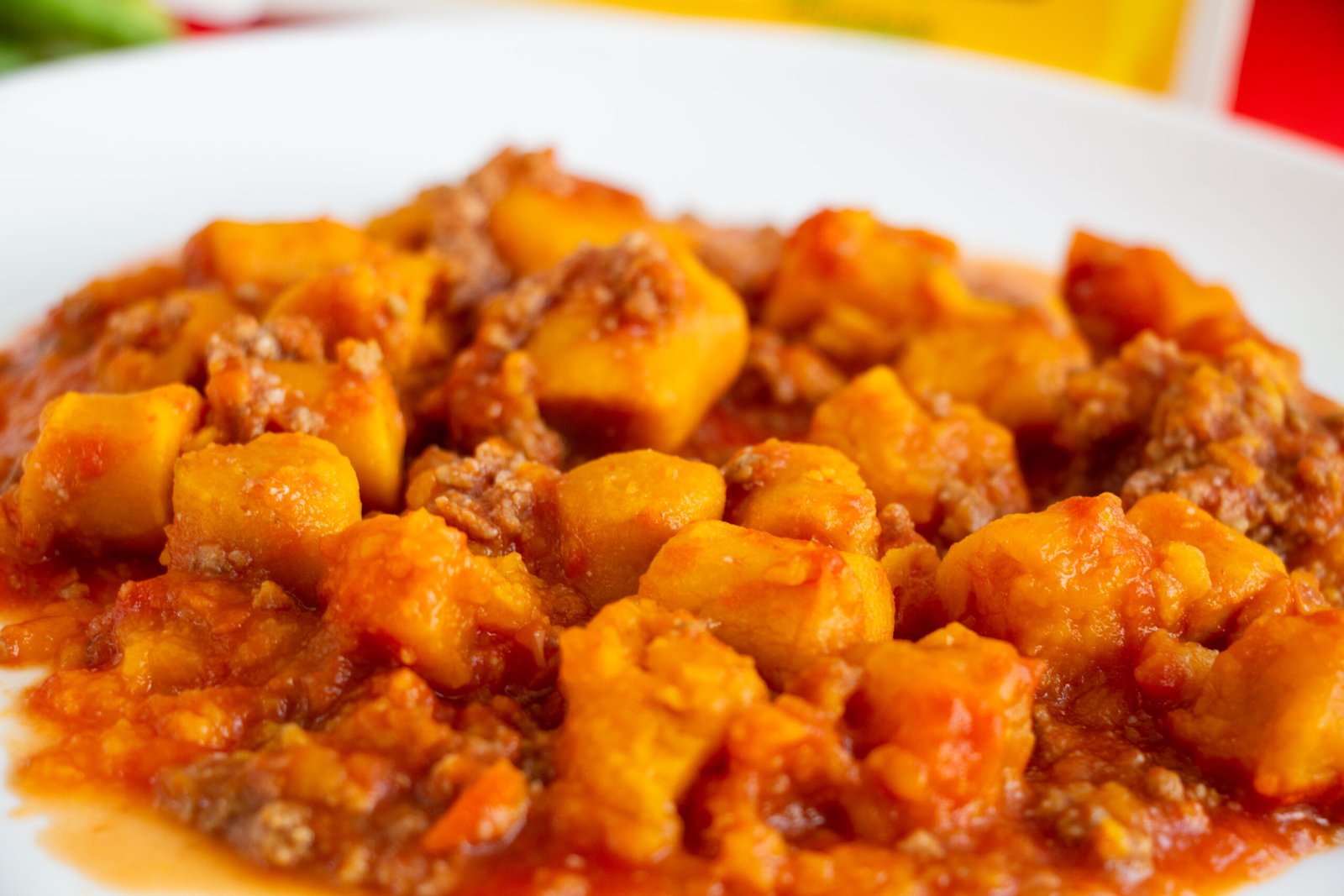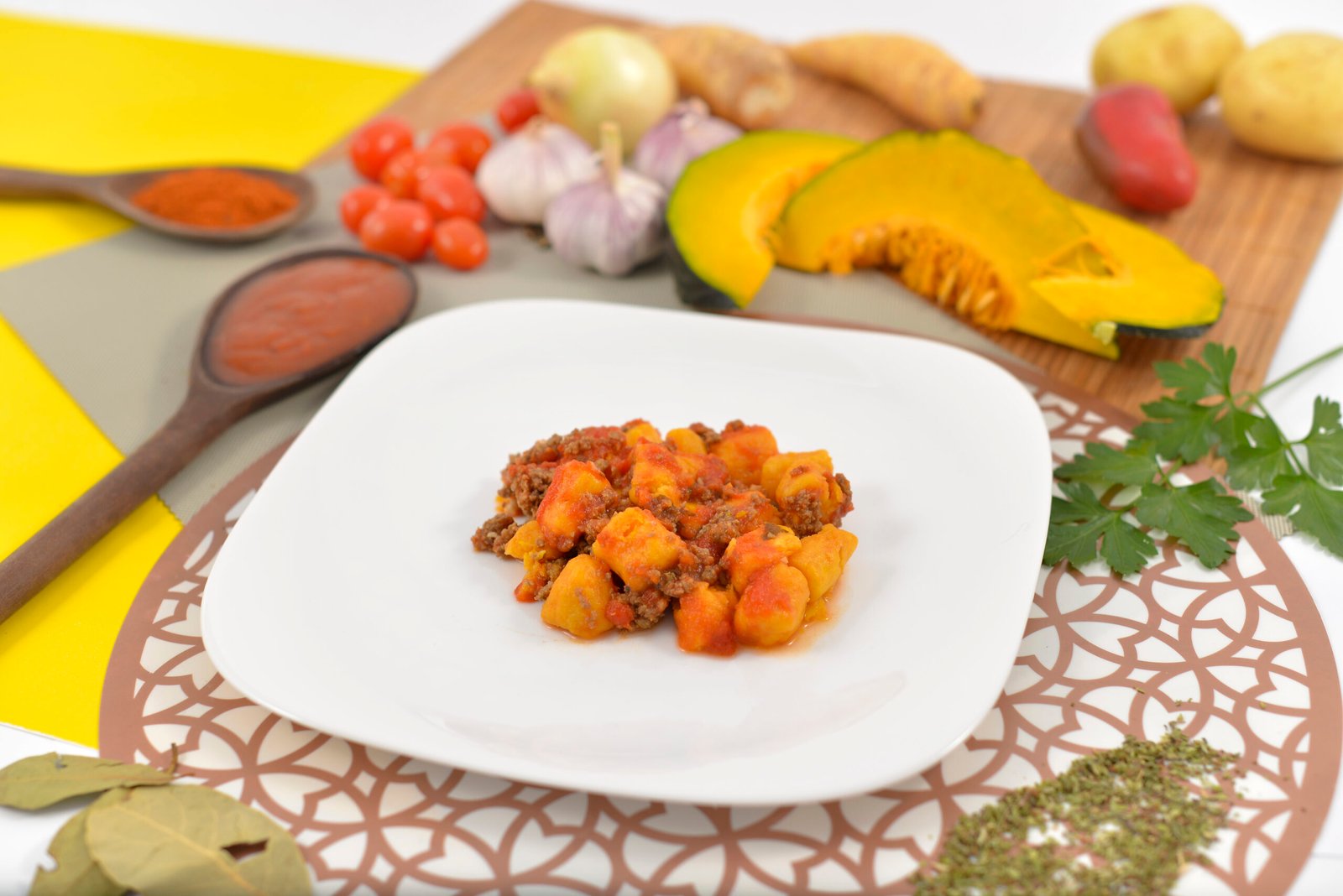 Nhoque de abobora cabotiã ao sugo e patinho moído