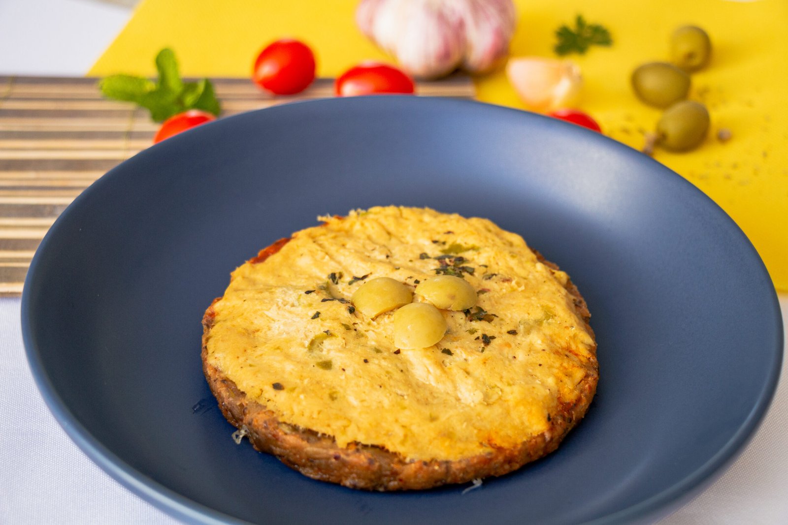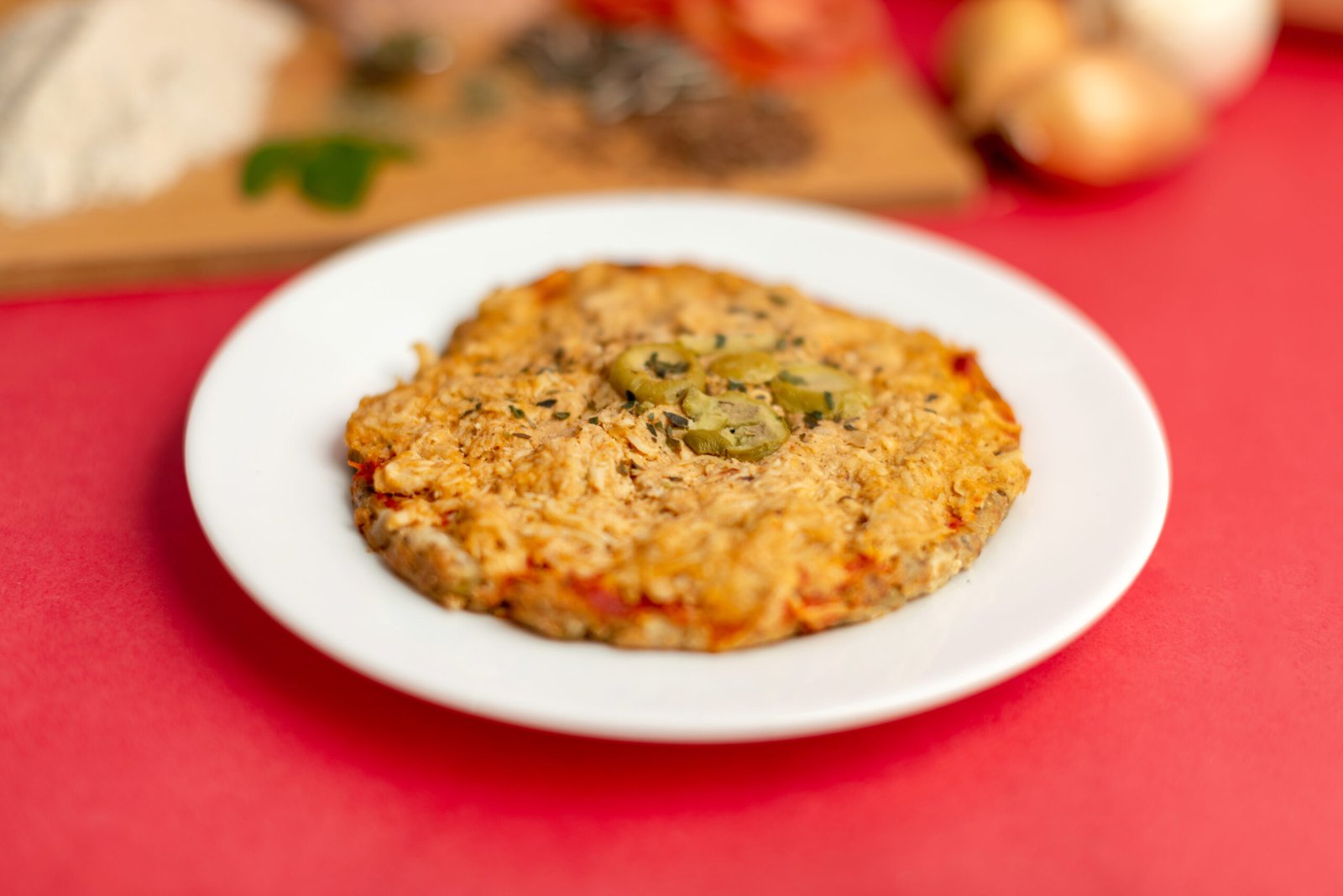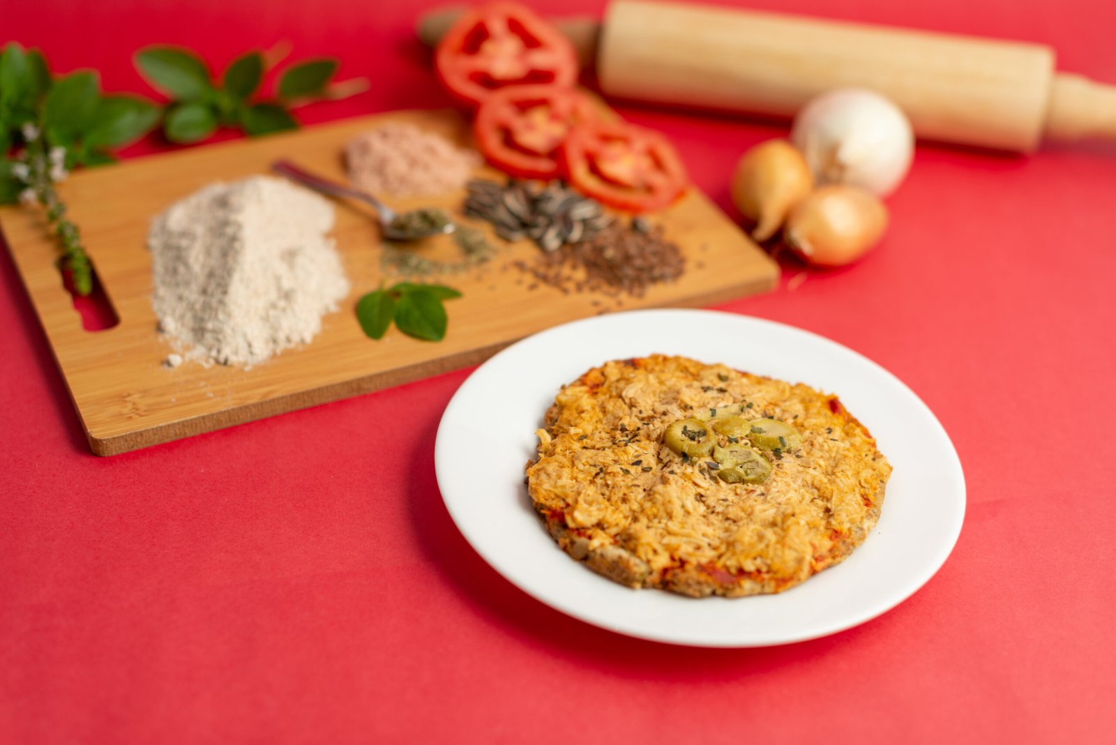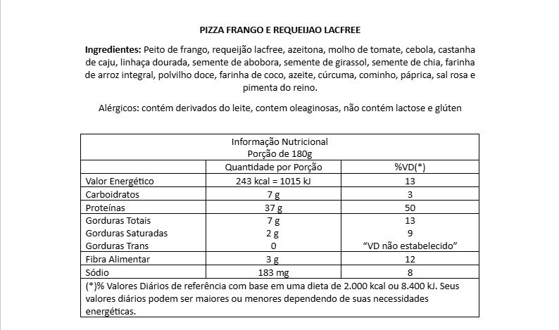 Peito de frango, requeijão lacfree, azeitona, molho de tomate, cebola, castanha de caju, linhaça dourada, semente de abobora, semente de girassol, semente de chia, farinha de arroz integral, polvilho doce, farinha de coco, azeite, cúrcuma, cominho, páprica, sal rosa e pimenta do reino.
