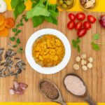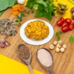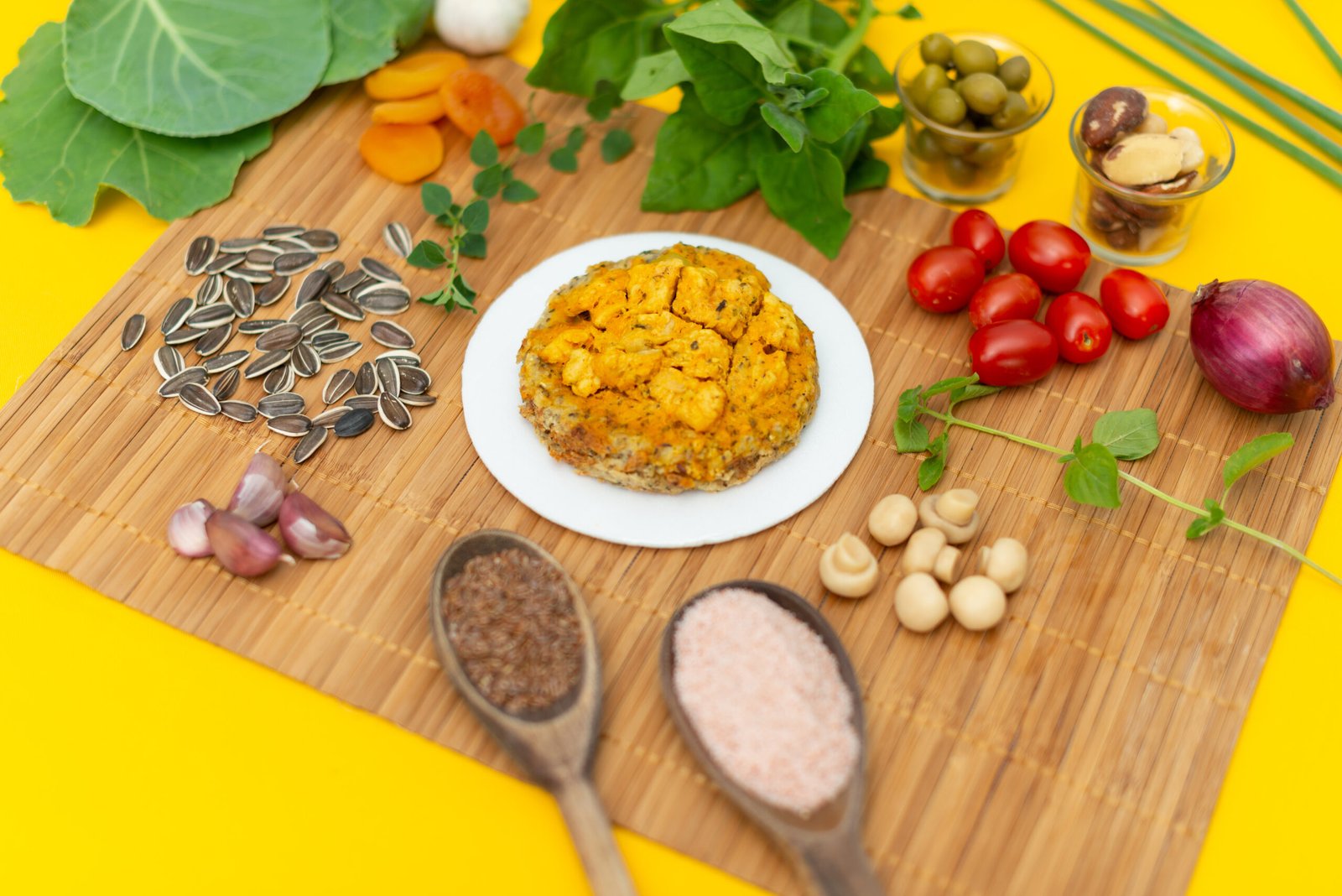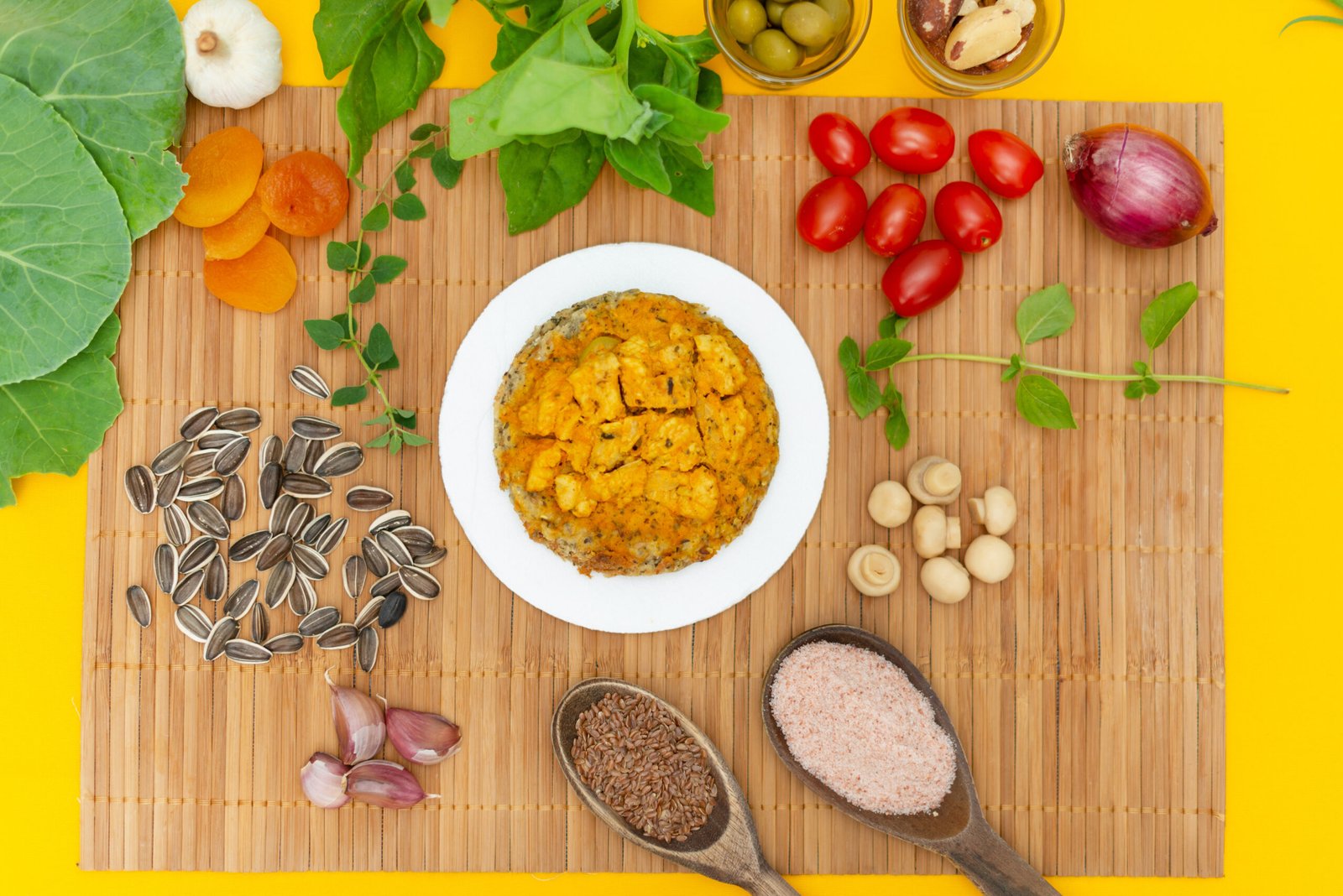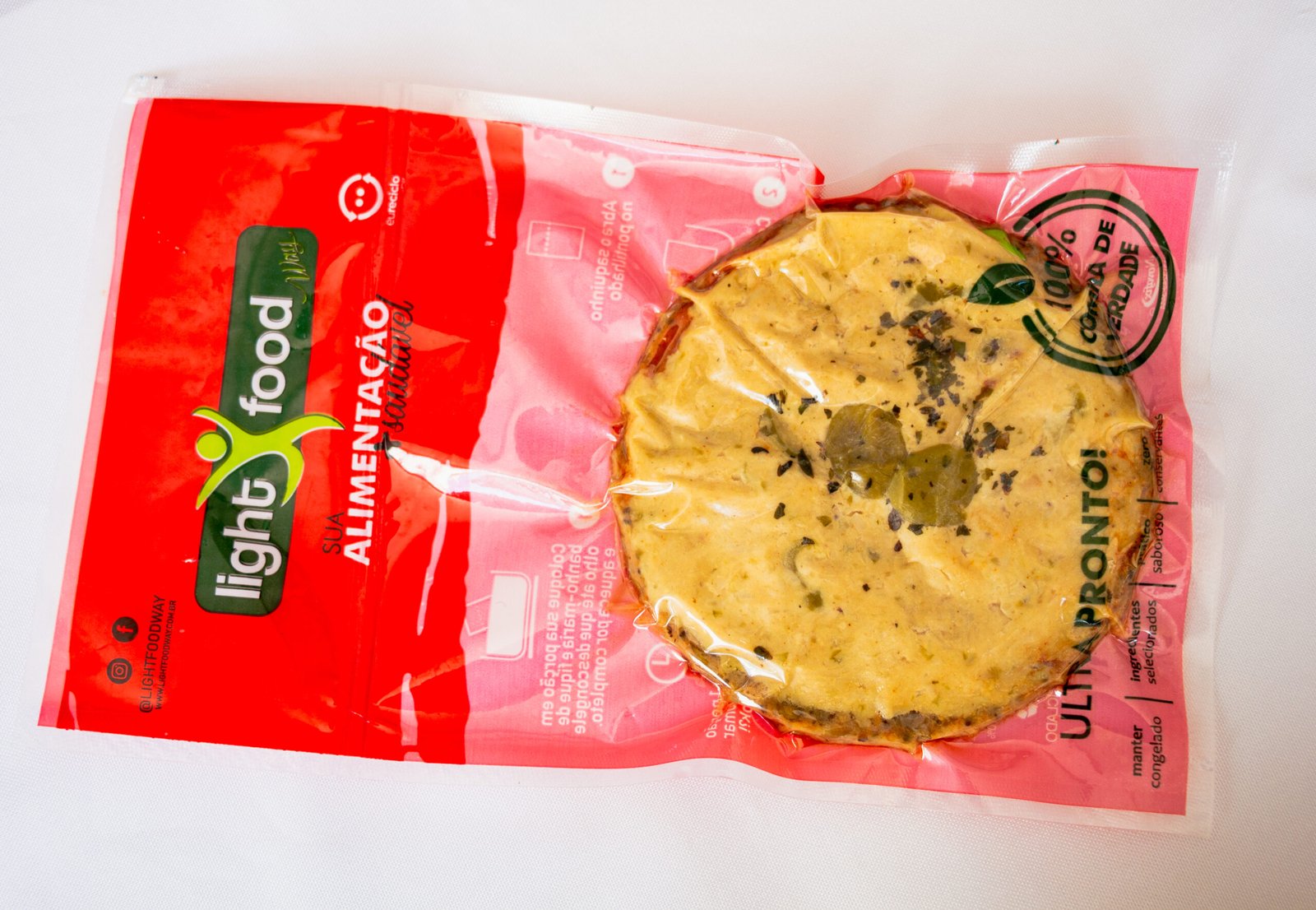 Peito de frango, requeijão lacfree, azeitona, molho de tomate, cebola, castanha de caju, linhaça dourada, semente de abobora, semente de girassol, semente de chia, farinha de arroz integral, polvilho doce, farinha de coco, azeite, cúrcuma, cominho, páprica, sal rosa e pimenta do reino.