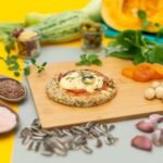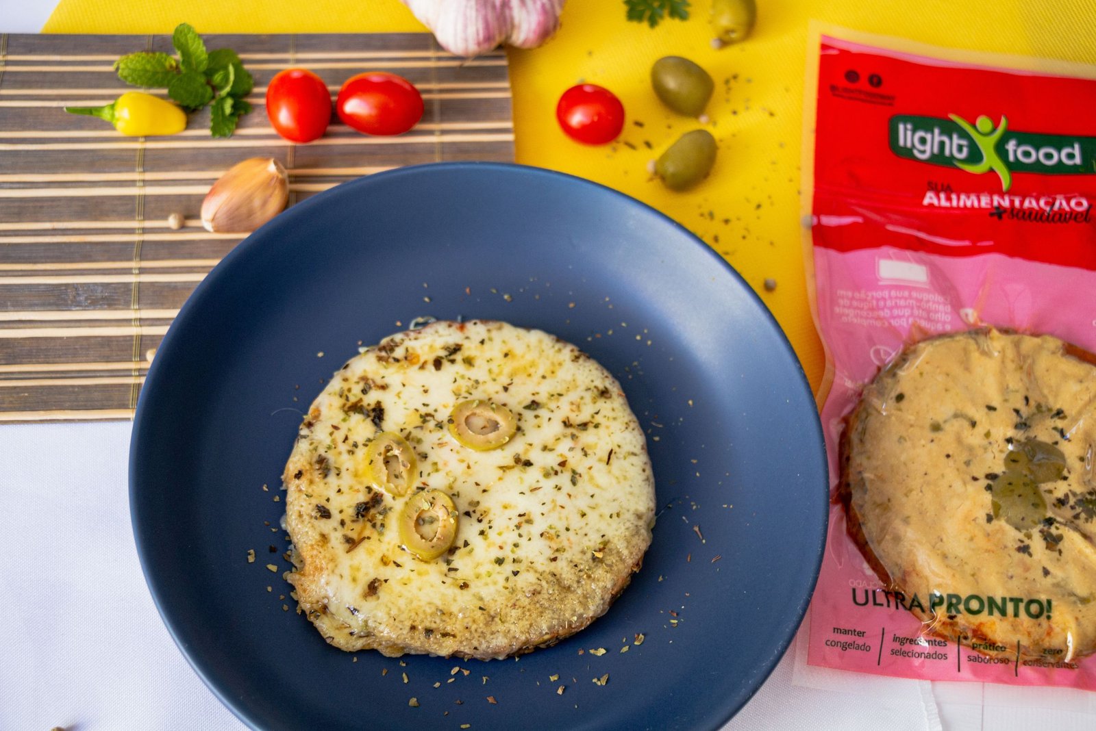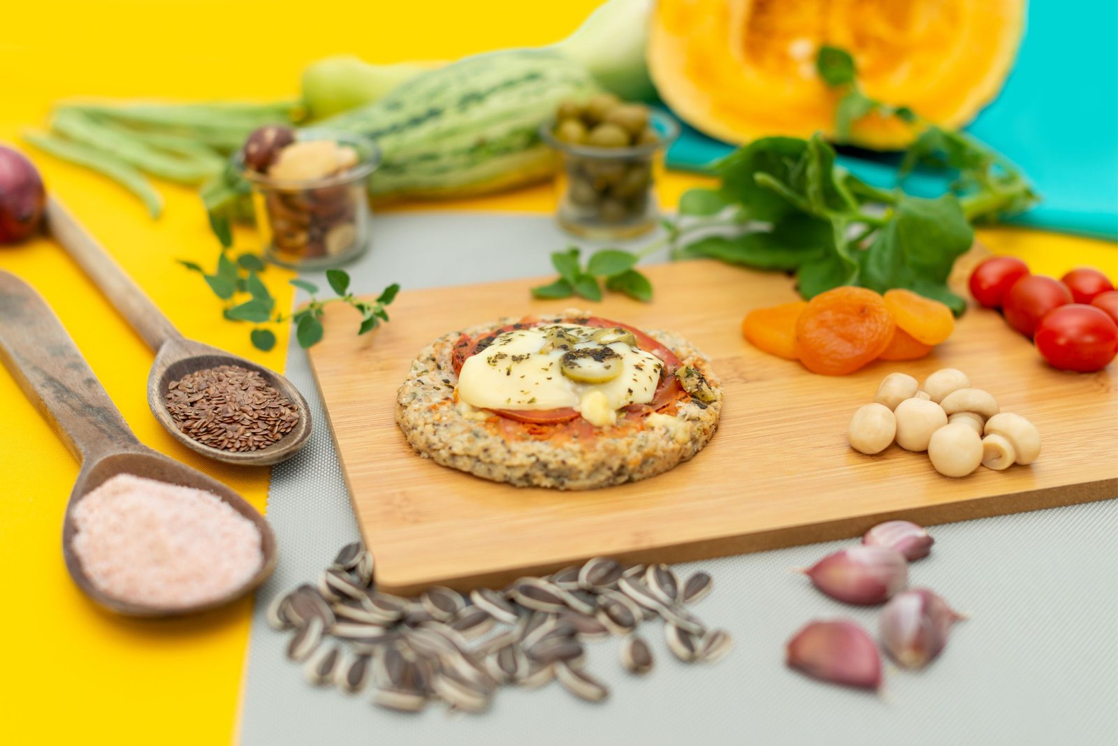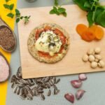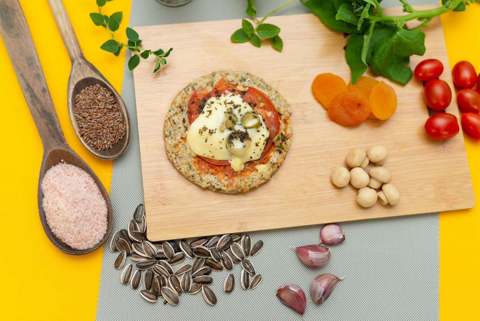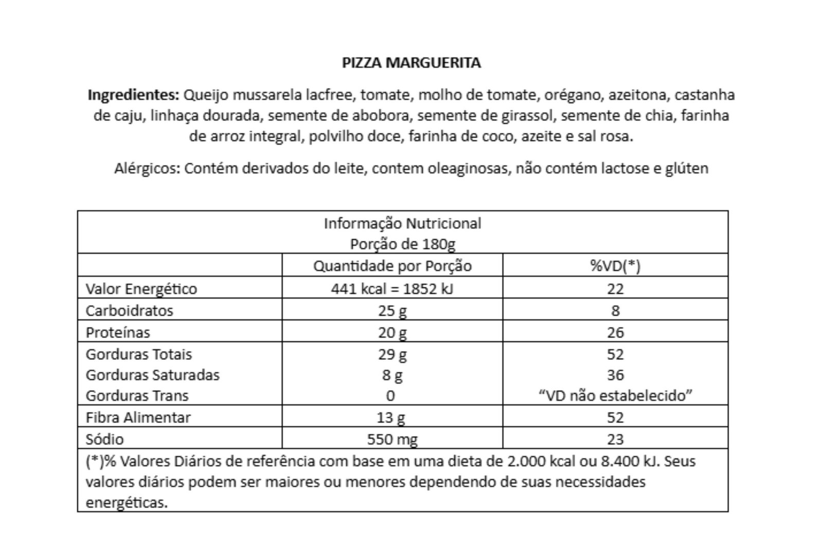 Queijo mussarela lacfree, tomate, molho de tomate, orégano, azeitona, castanha de caju, linhaça dourada, semente de abobora, semente de girassol, semente de chia, farinha de arroz integral, polvilho doce, farinha de coco, azeite e sal rosa.